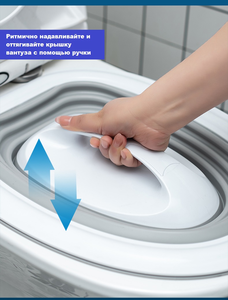 Возьмите вантуз за ручку и ритмичными движениями надавливайте на крышку. Под крышкой, благодаря находящемуся там воздуху, создается давление, достаточное для продавливания жидкости внутри чаши унитаза внутрь. Давление оказывается по всей поверхности чаши и потому оно заметно мощнее, чем точечное давление от обычного вантуза или швабры.